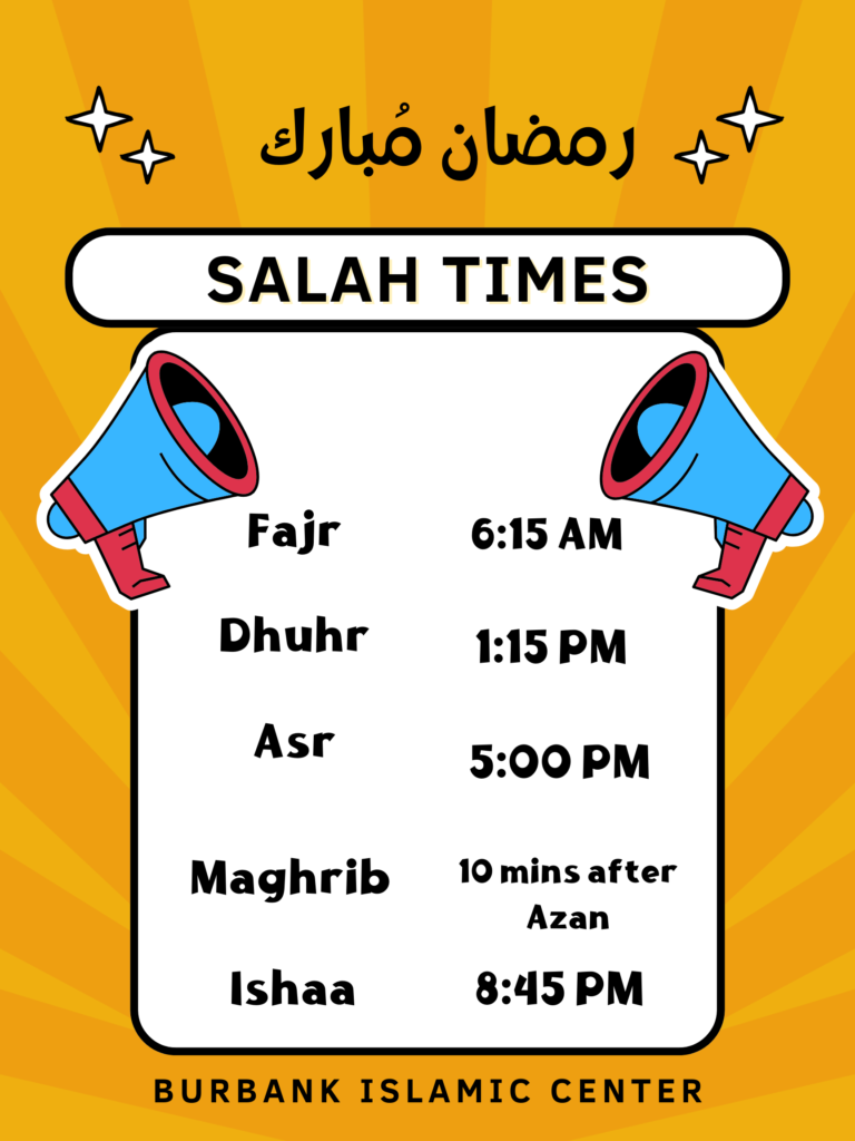 Home EVENT ANNOUCEMENT Daily Iqamah Times JUMUAH (FRIDAY) PRAYER Khutba (Sermon) at 1:15 PMIqamah (Prayer) at 1:45 PM Click here to subscribe to our mailing list!